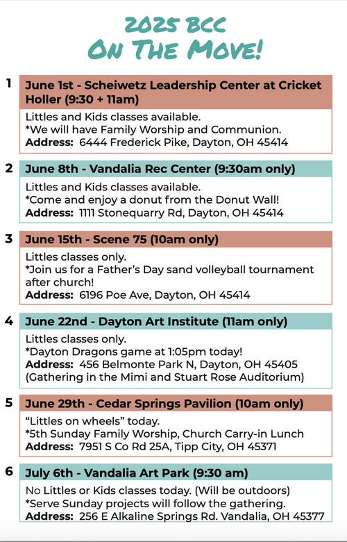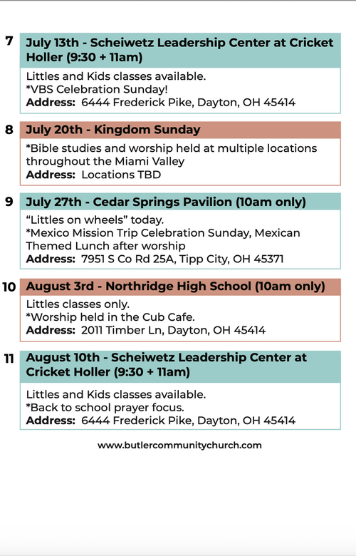 During the summer months, our church meets at various locations around the Dayton area - sometimes in gyms or event venues, other times in museums or parks, and we even spend a Sunday caring for our community through a variety of service projects!