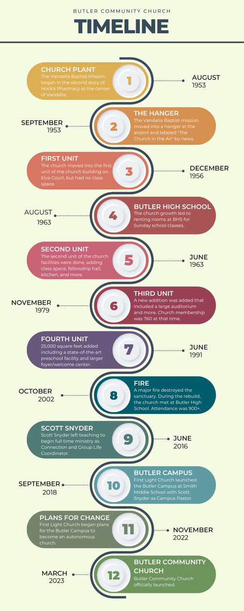 Butler Community Church launched as a campus of First Light Church in 2018, meeting at Smith Middle School as First Light Church – Butler Campus. By God’s grace, with the rich history and faithfulness of First Light Church of Vandalia, and the passionate community-driven leaders of Butler Campus, our church grew and flourished.